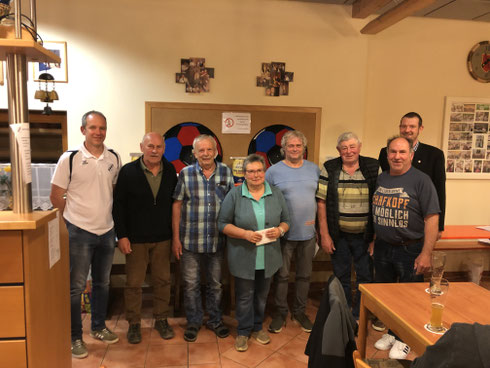 Die meisten Punkte und somit den ersten Platz sicherte sich Markus Weigl (2 von li.)vor Dieter Kathlun (Mitte) und Erwin Birkl (2 von re.) Der Organisator des Turniers Johann Springer (li.) und Vorstand Markus Matzeder (re.) gratulierten dem Trio zu ihrem Erfolg.
